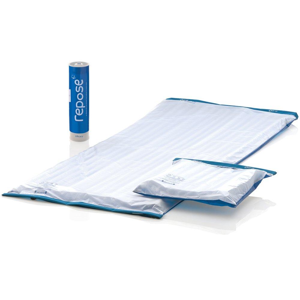 Repose - Repose Pressure Relieving Single Mattress Overlay, Cushion and Manual Pump - Inflatable Pressure Mattress and Cushion - Clinically Proven to Prevent Bed Sores and Pressure Ulcers Let us take the pressure off. Repose Mattress Overlay and Cushion are inflatable and designed specifically for standard beds and medical beds. It helps to prevent and treat pressure ulcers as well as minimise the risk of pressure damage. The reactive single-cell design distributes weight evenly and doesnt lose its shape. It is easy to clean and maintain. The single mattress overlays inflated size is L 1780mm x W 770mm and the cushions inflated size is L 450mm x W 450mm x H 75mm Unused items can be returned in their original condition for a full refund or replacement within 30 days. How to use the pressure redistribution Mattress Overlay in just 5 easy steps: Remove the air mattress from the pump Attach the pump to the mattress and inflate until you hear air Discontinue inflating and wait until you hear an audible click before disconnecting the pump Securely fasten the solid cap to the valve Secure to your bed * We recommend able-bodied person, caregiver or loved one to inflate cushion with the manual pump Let Repose take the pressure off Manufactured in the UK, Repose offers a range of pressure area care devices that are clinically proven to support the prevention and management of pressure damage. From heel protection and seat cushions to mattress overlays, all Repose products are suitable for high-risk patients in hospital and home care settings and have been used in the NHS for over 25 years.